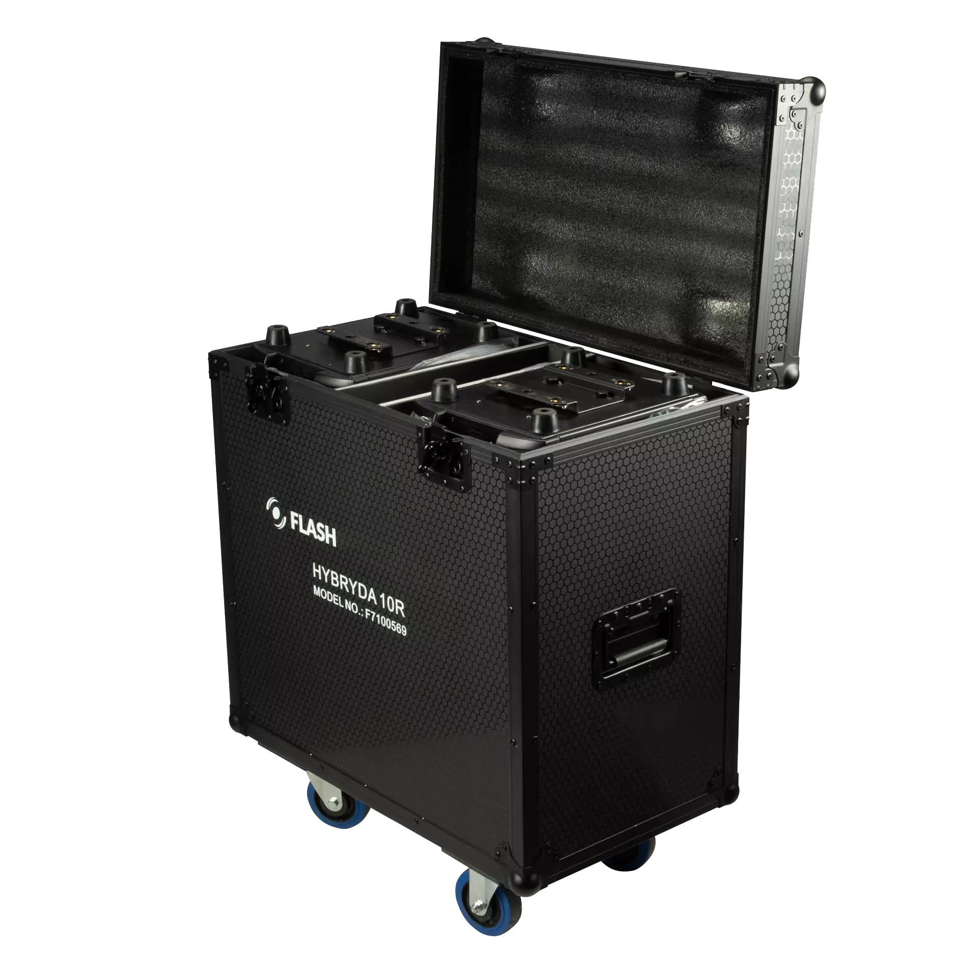 Eine massive Transportbox für zwei HYBRID 10R-Geräte sorgt für sichere Lagerung und Transport, dank Innenfächern, die Geräte, Kabel und Zubehör unterbringen können. Die Box ist mit vier stabilen Rädern mit Feststellern und bequemen Griffen ausgestattet, was den Transport erleichtert. Die gesamte Struktur ist mit Aluminiumprofilen und Kugelecken verstärkt, die den Kasten und seine Umgebung zusätzlich schützen, indem scharfe Kanten vermieden werden. Die einseitige Öffnung mit entsprechendem Neigungswinkel verhindert ein Herunterfallen des oberen Teils der Box und ermöglicht so einen einfachen und bequemen Zugriff auf die gelagerten Gegenstände. Der Innenraum mit Trennwänden ist mit weichem technischem Schaumstoff ausgekleidet, der die gelagerten Gegenstände effektiv vor Beschädigungen schützt.