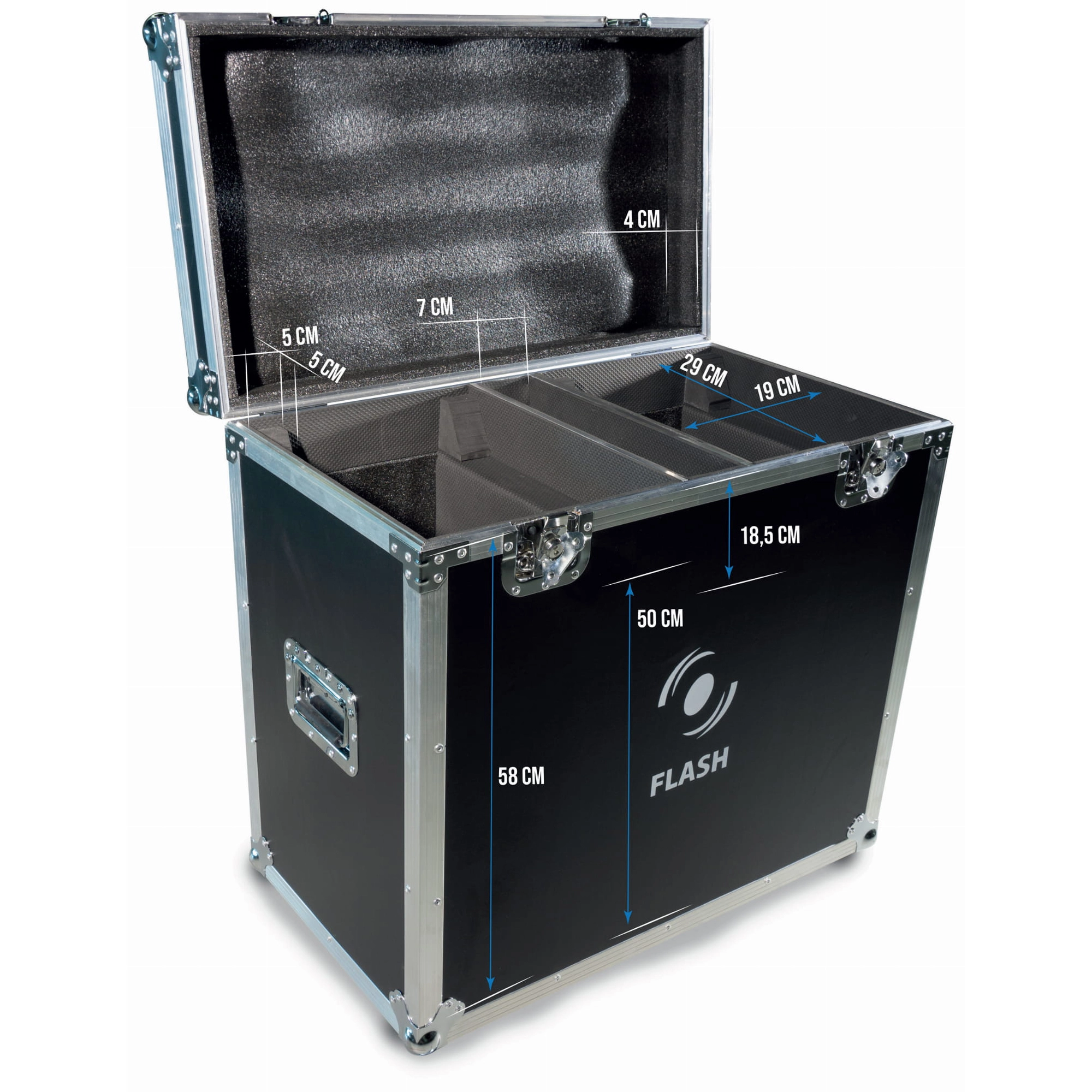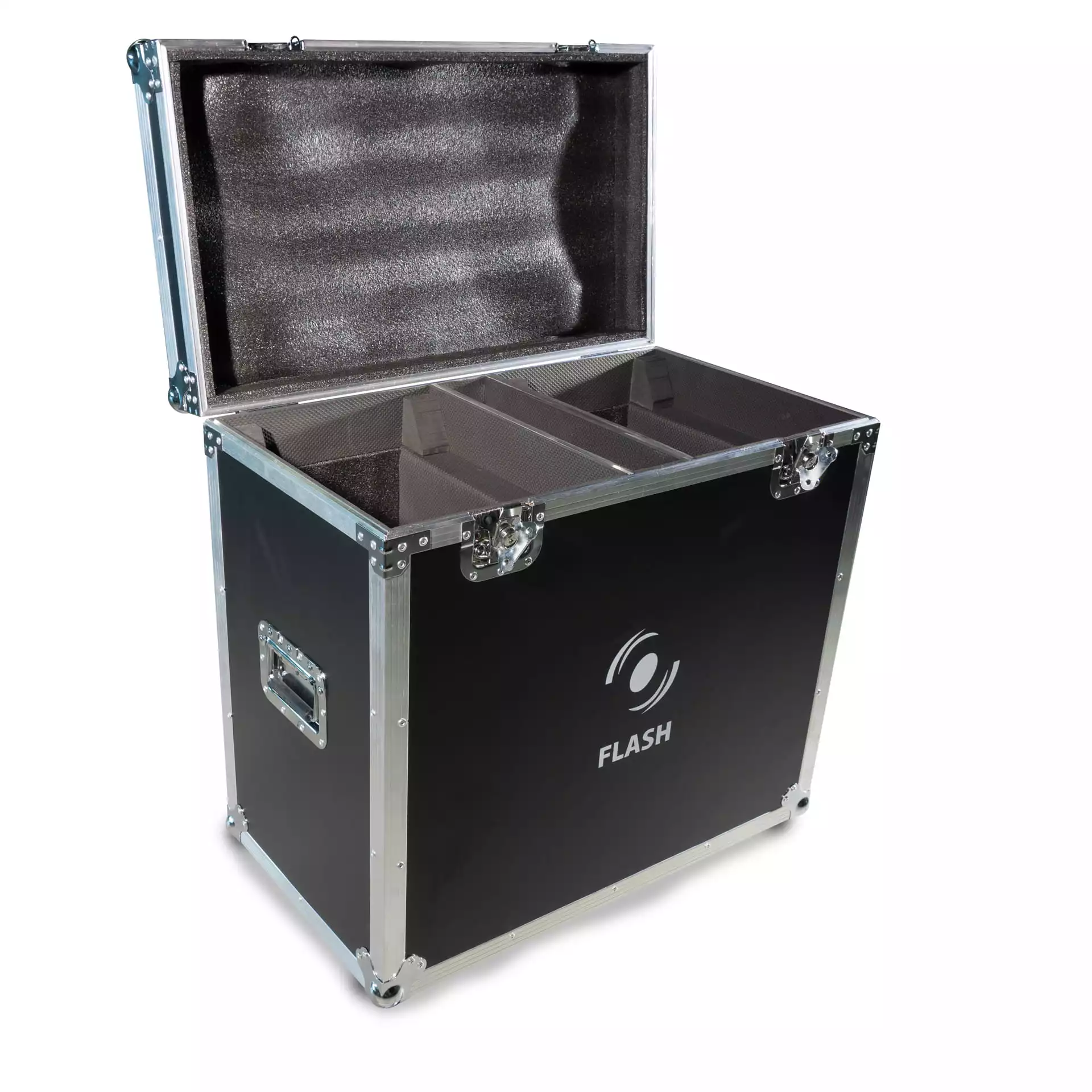 Massive Transportbox für 2 Geräte wie: 3R Moving Head 3in1.Dank der internen Trennwände sorgen Sie für eine sichere Aufbewahrung und den sicheren Transport von Geräten sowie Kabeln und Zubehör.Der Kasten ist mit Aluminiumprofilen verstärkt und verfügt an den Kanten über Kugelecken, die den Aufbau zusätzlich sichern und die Umgebung schützen, indem scharfe Kanten vermieden werden.Sie lässt sich einseitig öffnen und der entsprechende Neigungswinkel verhindert, dass der obere Teil der Box herunterfällt, sodass ein einfacher und bequemer Zugriff auf die gelagerten Gegenstände möglich ist. Mittelteil mit Fächern, gepolstert mit weichem technischem Schaumstoff, der die gelagerten Gegenstände perfekt vor Beschädigungen schützt. An den Seiten der Box befinden sich praktische Griffe zum Tragen.