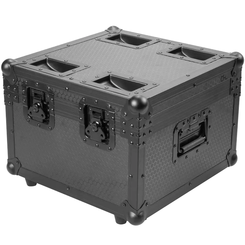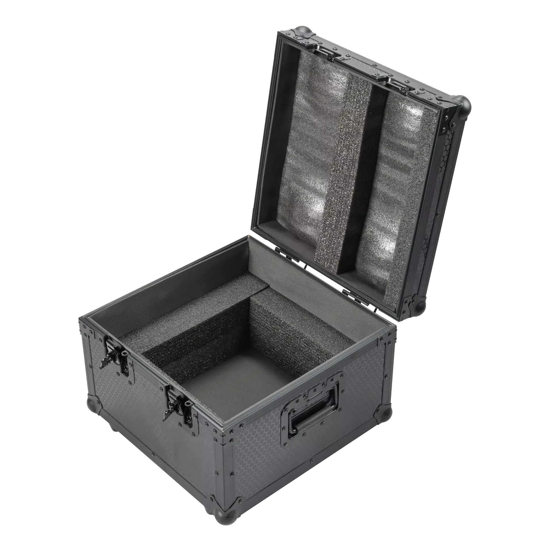 Die massive Transportbox für den 10W RGB LASER sorgt durch ein durchdachtes Innenfach für eine sichere Aufbewahrung und Transport des Geräts, der Kabel und des Zubehörs. Der Kasten ist mit Aluminiumprofilen verstärkt und Kugelecken an den Kanten schützen die Struktur zusätzlich, wodurch scharfe Kanten vermieden und die Umgebung geschont werden. Auf einer Seite geöffnet, fällt der obere Teil nicht herunter, was einen einfachen Zugang zum Innenraum ermöglicht. Die Innenseite ist mit weichem technischem Schaumstoff ausgekleidet, der die gelagerten Gegenstände effektiv vor Beschädigungen schützt. An den Seiten der Box befinden sich bequeme Griffe, die das Tragen erleichtern.
