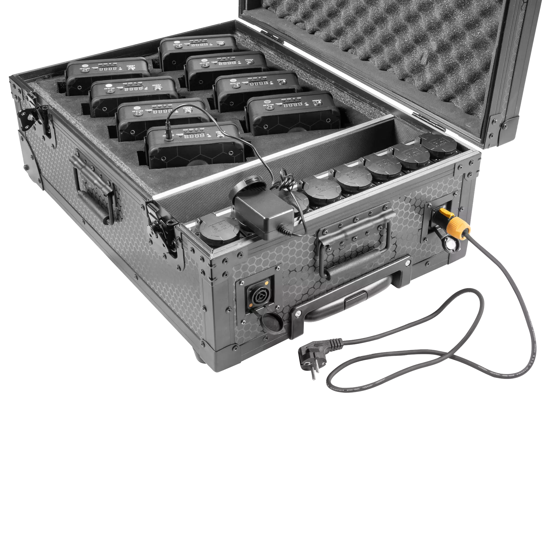 Massive transport box for 8 ParACCU 320 WDMX devices. Thanks to internal partitions, you will ensure safe storage and transport of eight devices, along with cables and accessories. The box is equipped with two stable wheels, comfortable handles enabling its carrying, a retractable handle, and the whole has been reinforced with aluminum profiles with ball corners, which additionally secure the structure, and protect the surroundings by eliminating sharp edges. It is opened on one side, and the appropriate angle of inclination means that the upper part of the box does not fall, providing easy and convenient access to stored items. The center with partitions is padded with soft technical foam, which perfectly protects the stored elements from damage.