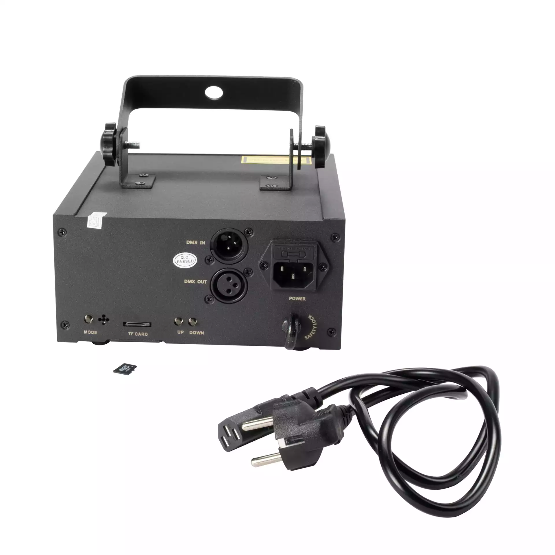LASER 1W RGB 15kpps SD DMX is a new dimension of light effects. This compact device with a power of 1W (300mW - Red, 70mW - Green, 700mW - Blue) provides incredible color intensity and dynamic patterns. With a speed of 15kpps it becomes an ideal choice for events and parties. Thanks to many control modes, such as DMX512, Auto, Sound, TF Card (Micro SD) and Master-Slave, the user has full control over the generated effects. The solid steel housing guarantees durability, and the handle with a mounting hole ensures stable and safe installation of the device.