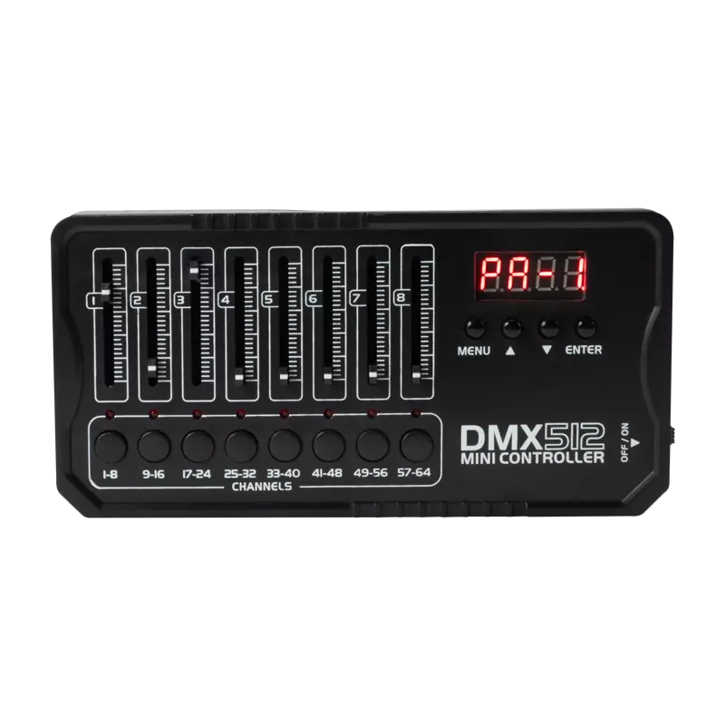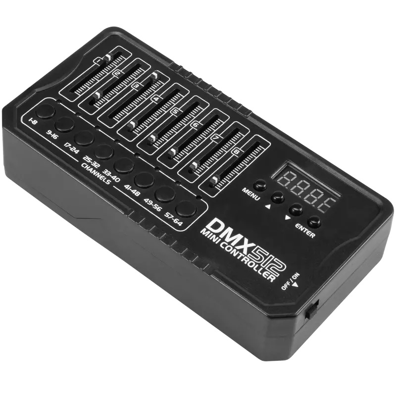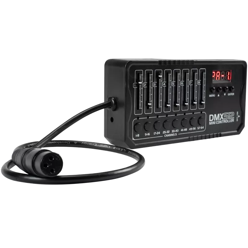 BATT CONTROLLER DMX MINI 512 es un controlador DMX multitarea que permite controlar un solo dispositivo o un grupo de dispositivos, con la función de crear escenas y shows programables mediante protocolo DMX. Gracias a él, podemos gestionar fácilmente el funcionamiento de varios tipos de dispositivos escénicos mediante controles deslizantes.