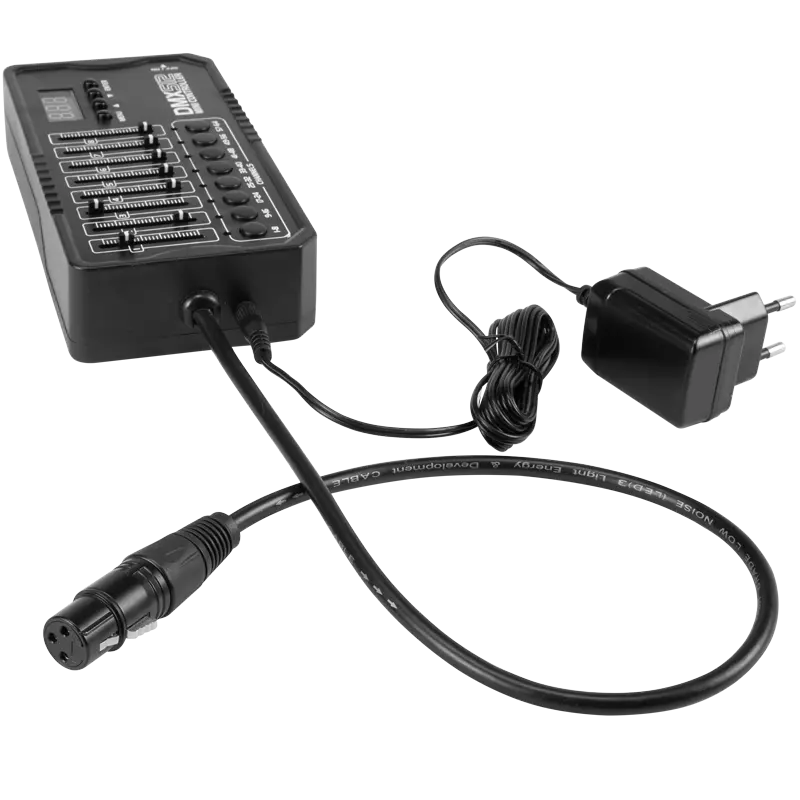 Especificación:- controla hasta 512 canales DMX- 8 controles deslizantes- 8 botones de control- 4 botones de configuración- Pantalla de 8 segmentos- alimentado por batería (batería incorporada)- Toma DMX XLR de 3 pines- Fuente de alimentación CC 12-18 V, 500 mA- tensión de alimentación: 100-240 V, 0,3 A- consumo de energía: 6W
