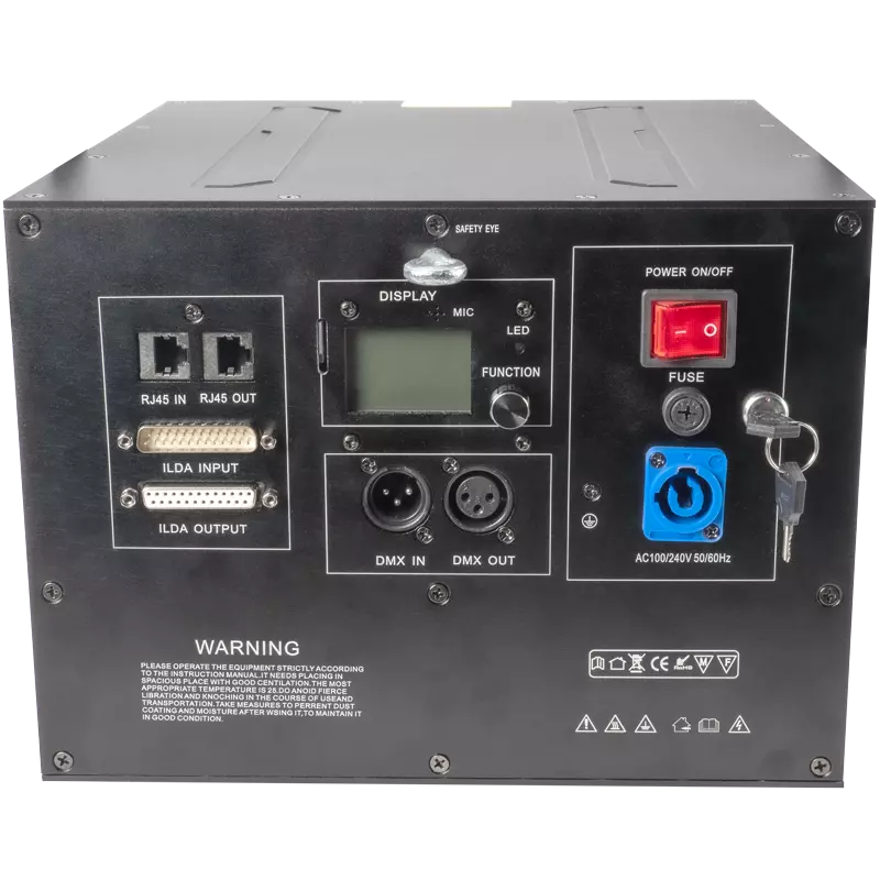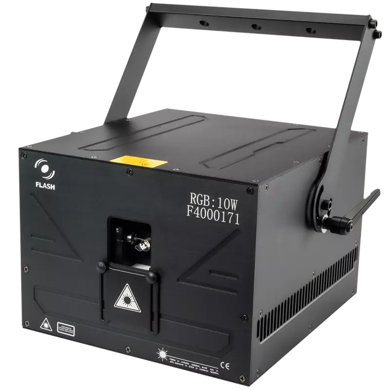 El LÁSER RGB de 10W se distingue por su alta potencia de 180W y combinaciones de luz efectivas. La intensidad, la velocidad y el patrón de luz se pueden controlar a través de los siguientes modos: ILDA (control desde una computadora), DMX512, PRG (programa desde una tarjeta TF), ILD (programa desde una tarjeta TF), modo SONIDO, modo AUTO, Maestro-esclavo.Formato del archivo de reproducción (.ild).El láser genera diámetros de haz <6 mm con divergencia <1,5 mrad. y el escáner óptico de 40K de alta velocidad proporciona un escaneo de ángulo alto de (+/-) 30°.Láser ROJO: 3000 mW, longitud de onda 638 nmLáser VERDE: 3000 mW, longitud de onda 525 nmLáser AZUL: 4000 mW, longitud de onda 450 nmAdemás, el dispositivo está equipado con numerosos dispositivos de seguridad para garantizar la protección de la seguridad: interruptor de llave láser, bloqueo láser remoto, control SFS (control de seguridad del escáner ON/OFF).