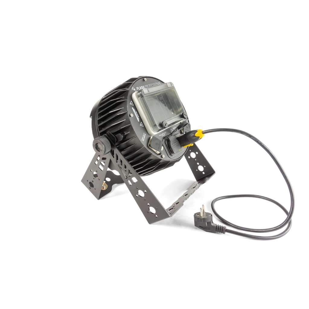 Reflector LED PAR diseñado para funcionar en condiciones de mayor humedad, resistente al polvo y la lluvia. En la escala de estanqueidad, la carcasa está clasificada como IP65, lo que permite su uso en eventos al aire libre o como iluminación arquitectónica sin temor a sufrir daños causados por las condiciones climáticas. El sistema de refrigeración pasivo (sin ventilador) también lo convierte en una solución perfecta en lugares donde se requiere una iluminación completamente silenciosa. El dispositivo tiene todas las ventajas del reflector Flash Professional estándar de 19x10W con software Mk2.