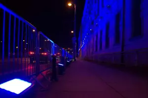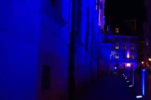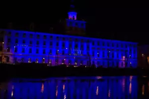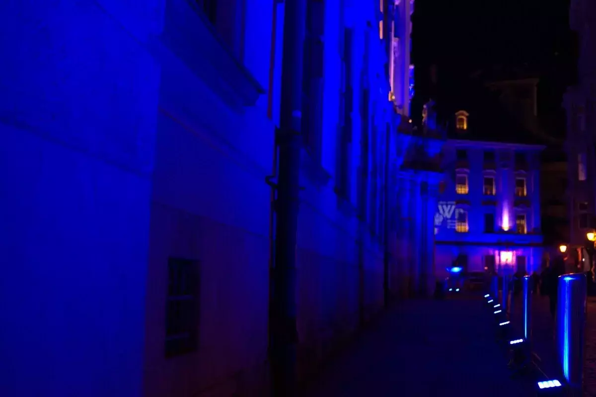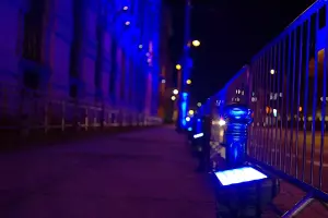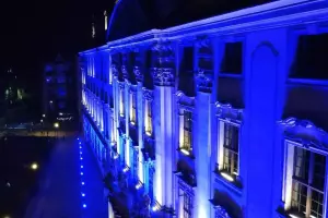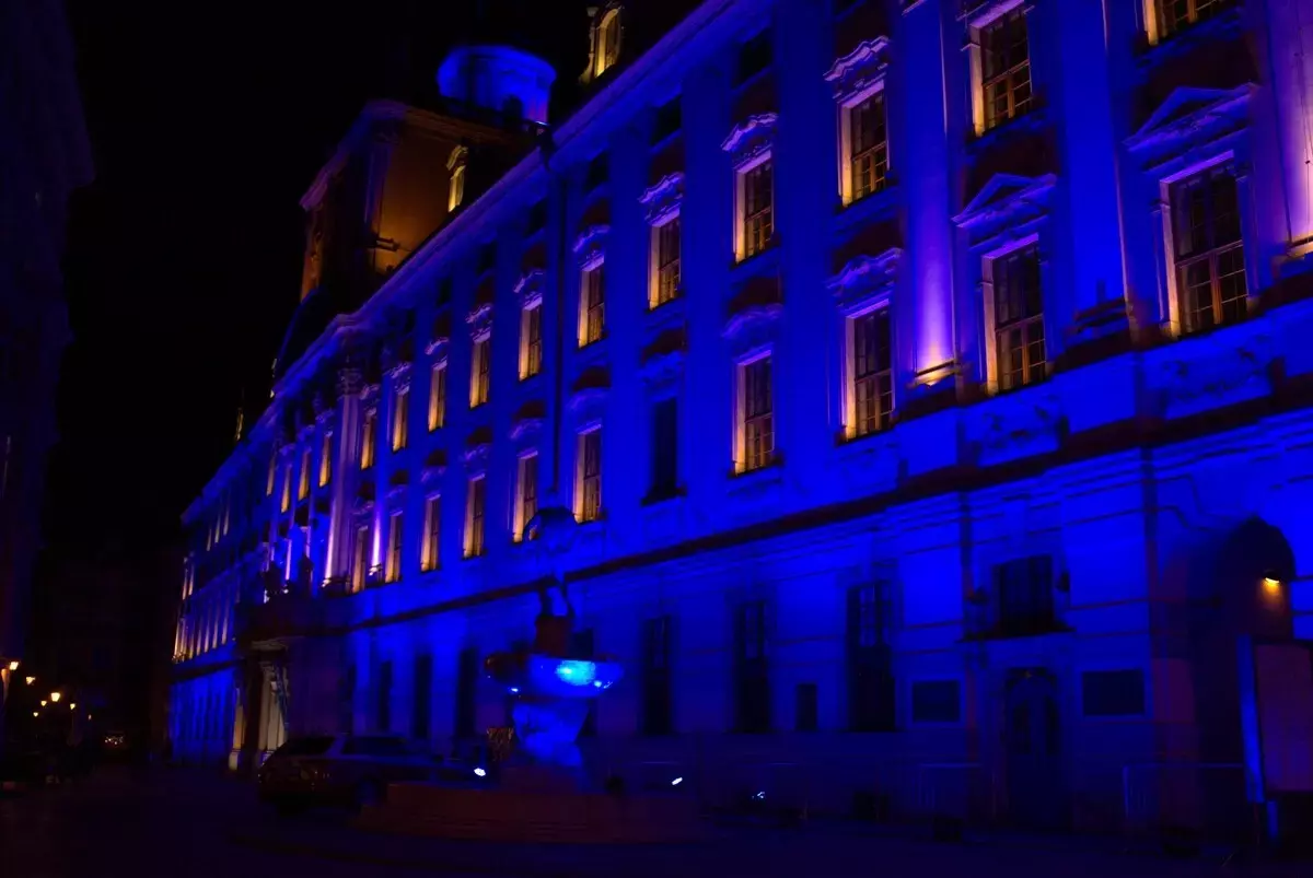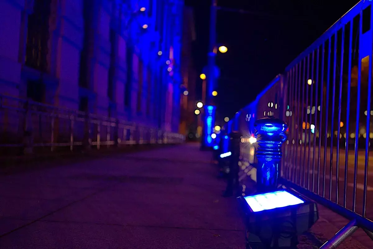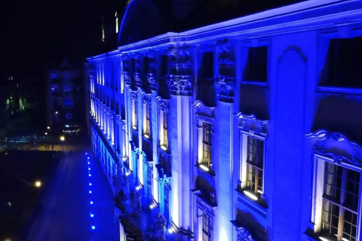 Tym razem jednak — z okazji jubileuszu — monumentalny gmach zanurzył się w intensywnym, głębokim błękicie, podkreślając wyjątkowy charakter obchodów oraz historię miejsca. Iluminacja była w pełni czytelna i efektowna przez dwie kolejne noce, mimo trudnych warunków i dużej skali obiektu.