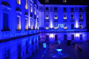 Na co dzień fasada uczelni jest oświetlana klasycznym, miękkim światłem.