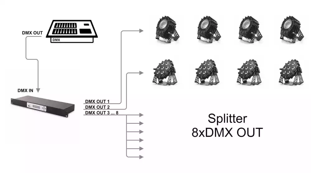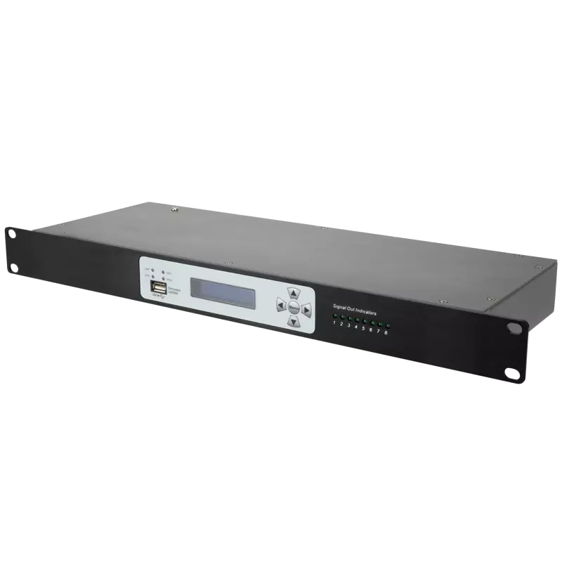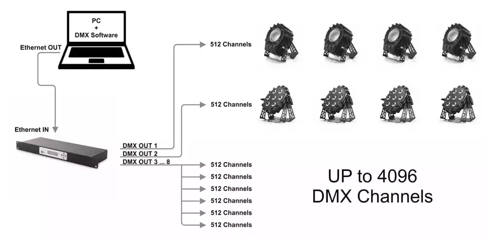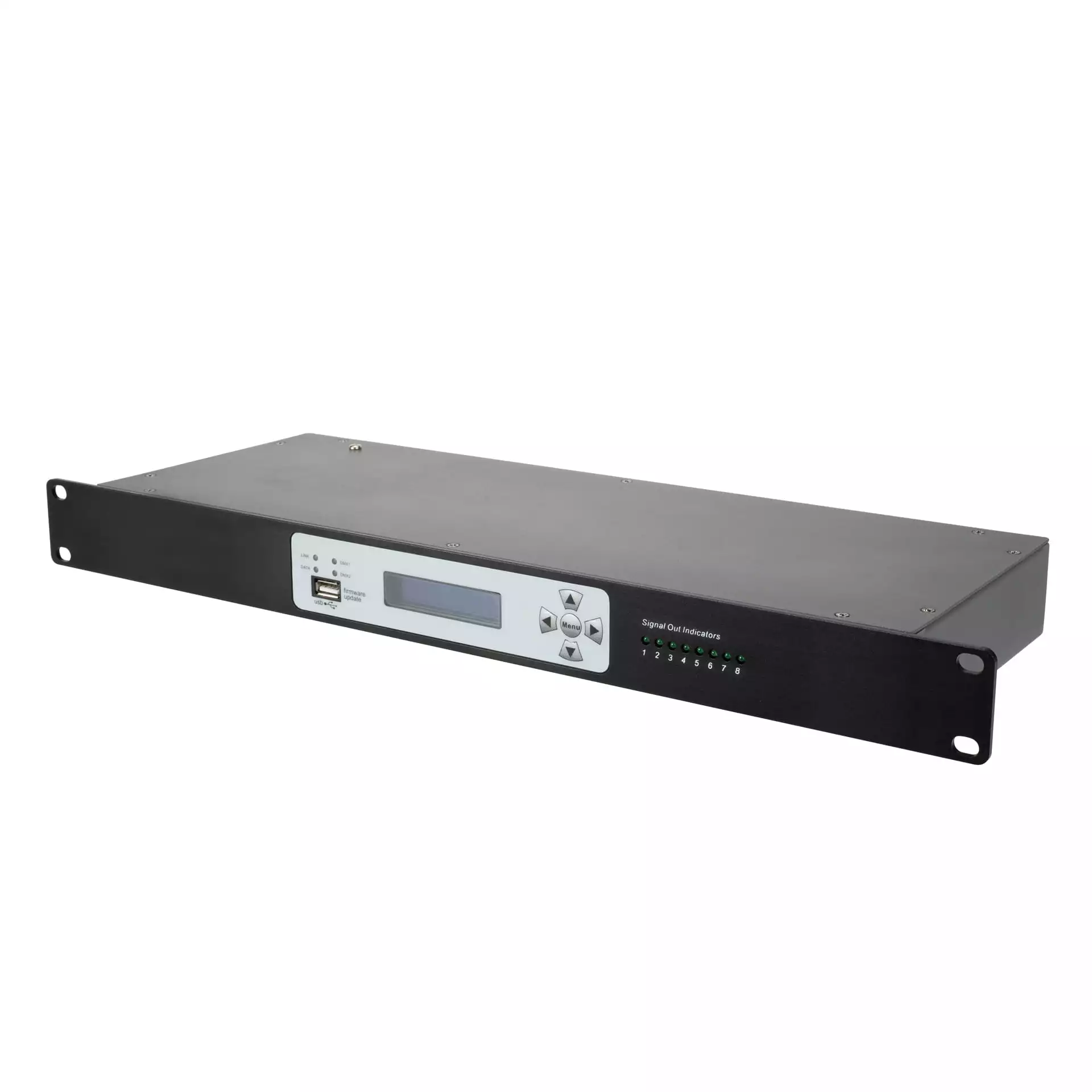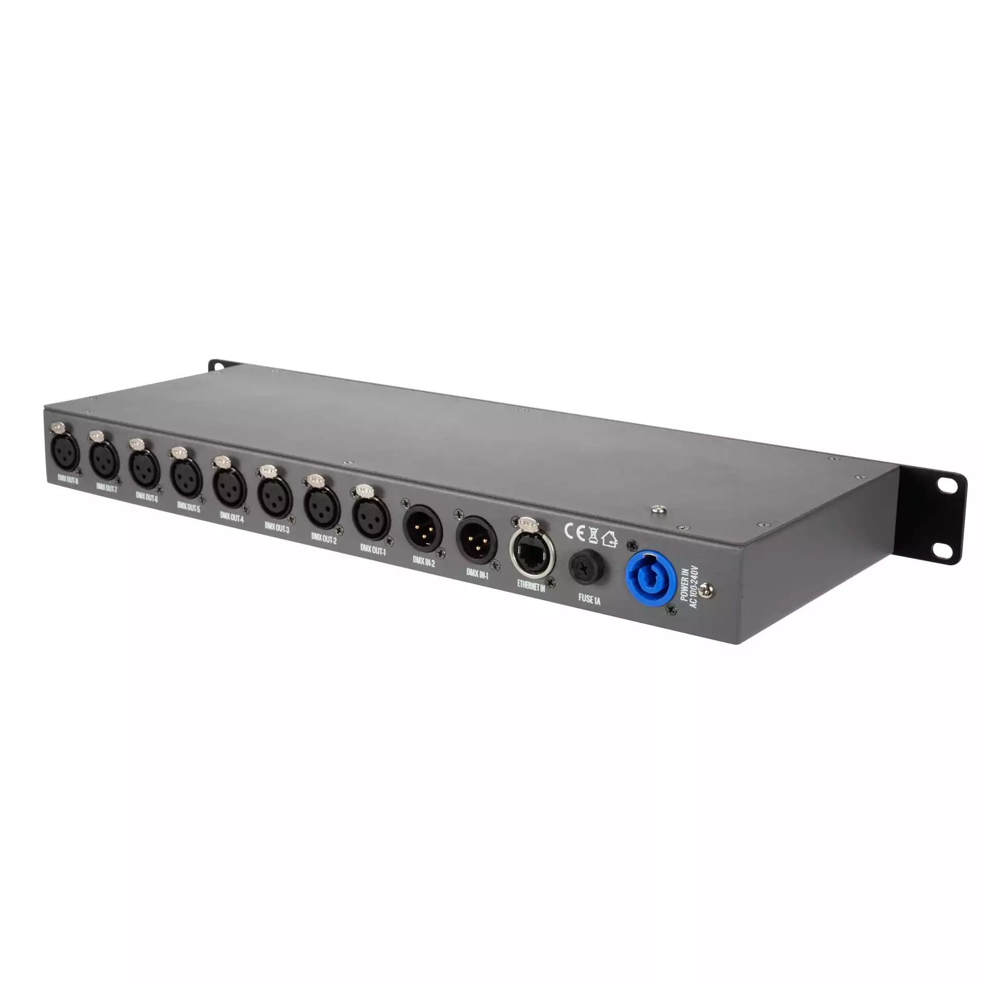 BRAMKA ARTNET/ DMX 8x512 ch to niezawodny, zaawansowany i wszechstronne urządzenie z ośmio portową bramką ArtNet, do DMX 8x512. Wyposażony w funkcję splittera DMX oraz hub-a Art-Net, umożliwiając tworzenie oraz konfigurowanie sieci DMX, na potrzeby dużych instalacji oświetleniowych. W urządzeniu o wielkości 1U, zastosowano 8 izolowanych galwanicznie wyjść, 2x DMX IN, Ethernet (RJ45) IN/THRU, USB Port, wyświetlacz LCD z intuicyjnym menu, jasne diody led sygnalizującą status sygnału wyjściowego.