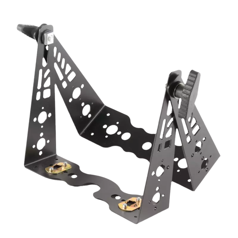 Metalowy uchwyt (do LED PAR). Uchwyt zapewniający stabilność dla urządzeń montowanych w pozycji stojącej.Dzięki licznym otworom montażowym, stanowi bazę dla innego typu mocowań, w tym zawieszania urządzeń na konstrukcjach.