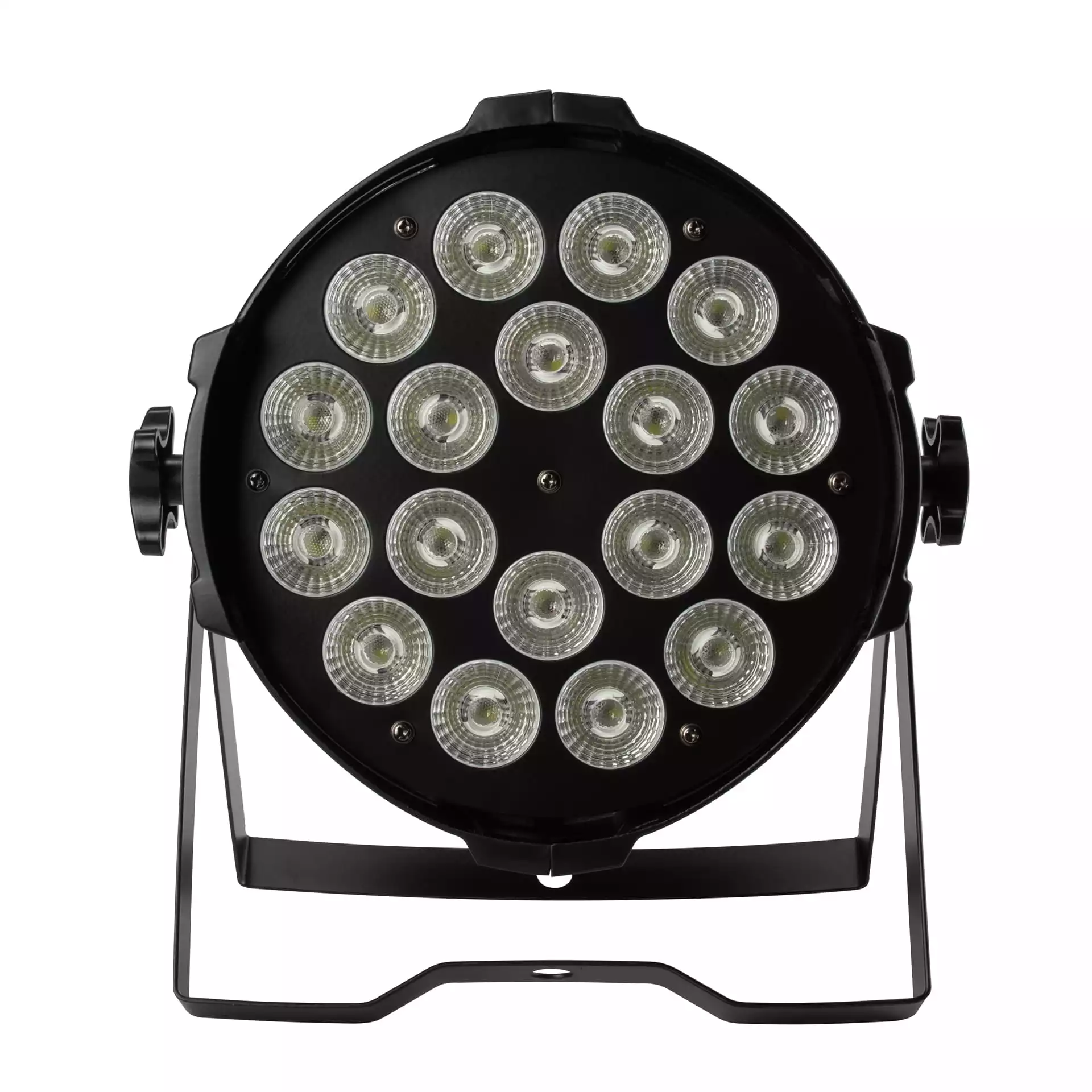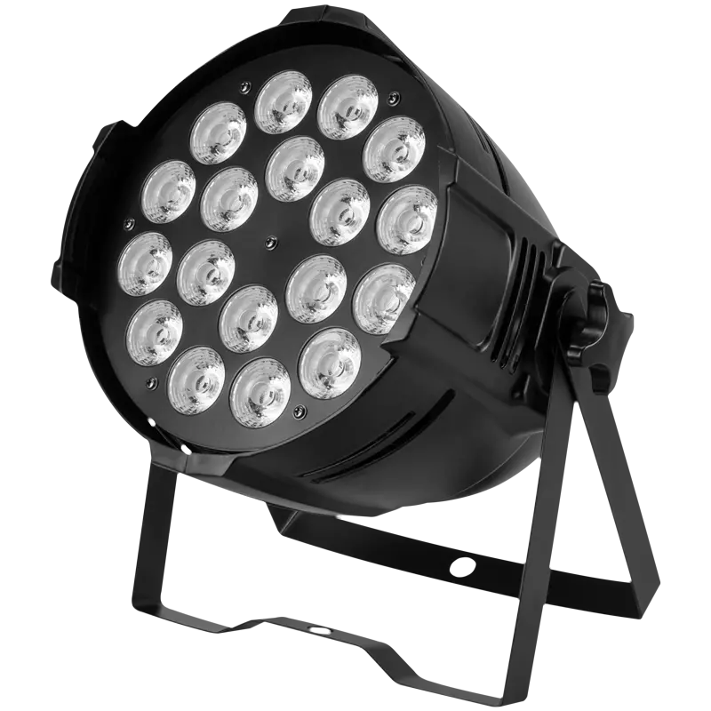 PAR64 LED 1810 ALU v2 to urządzenie o dużej mocy, zapewniające mocne światło o dalekim zasięgu.Reflektor dzięki zastosowaniu 18 diod o mocy 10W każda, emituje praktycznie nieograniczoną kombinację barw RGBW z płynnym mieszaniem kolorów. Urządzenie posiada aluminiową białą obudowę, aktywne chłodzenie, złącza PowerCON IN/OUT oraz wyposażone jest w uniwersalny podwójny uchwyt, dzięki któremu bardzo łatwo go zawiesić lub po prostu postawić na ziemi.